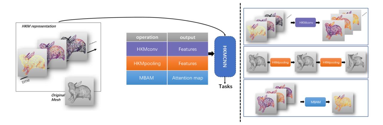 卷积神经网络(CNN)在各种计算机视觉和模式识别应用中取得了显著的成果。然而,计算机图形和几何处理通常研究具有非欧几里得基础结构的网格曲面。由于CNN是基于欧几里得域进行运算的,CNN的基本运算,如卷积和池化,在非欧几里得域中没有很好的定义,基于深度学习的方法不能广泛应用于三维网格数据分析。为了解决这个问题,该研究利用非欧几里得域的热扩散,提出了一种新的网格表示,称为热核网格。热核网格表示将网格表面表示为一个时空图信号,在每个时间间隔以欧几里得结构在网格边缘采样。根据上述提出的表示性质,提出了基于热核网格的卷积神经网络(HKMCNN),其中包括基于热核网格的卷积运算(HKMconv)、基于热核网格的卷积运算(HKMpooling)和网格域上的注意机制(MBAM)。HKMconv满足特征提取的卷积不变性,避免了网格数据读取时顺序不同带来的卷积结果变化的问题,从而提升了模型的稳定性;HKMpooling通过时空变换实现池化过程中自适应地检测和保持网格的结构特征,并成功降低计算复杂性;所提出的注意力机制可以通过有效地整合网格的全局信息来关注与任务最相关的关键结构信息来提高性能。大量的网格分类和分割实验证明了该方法的有效性和高效性,为三维网格提供了一个基础分析工具。