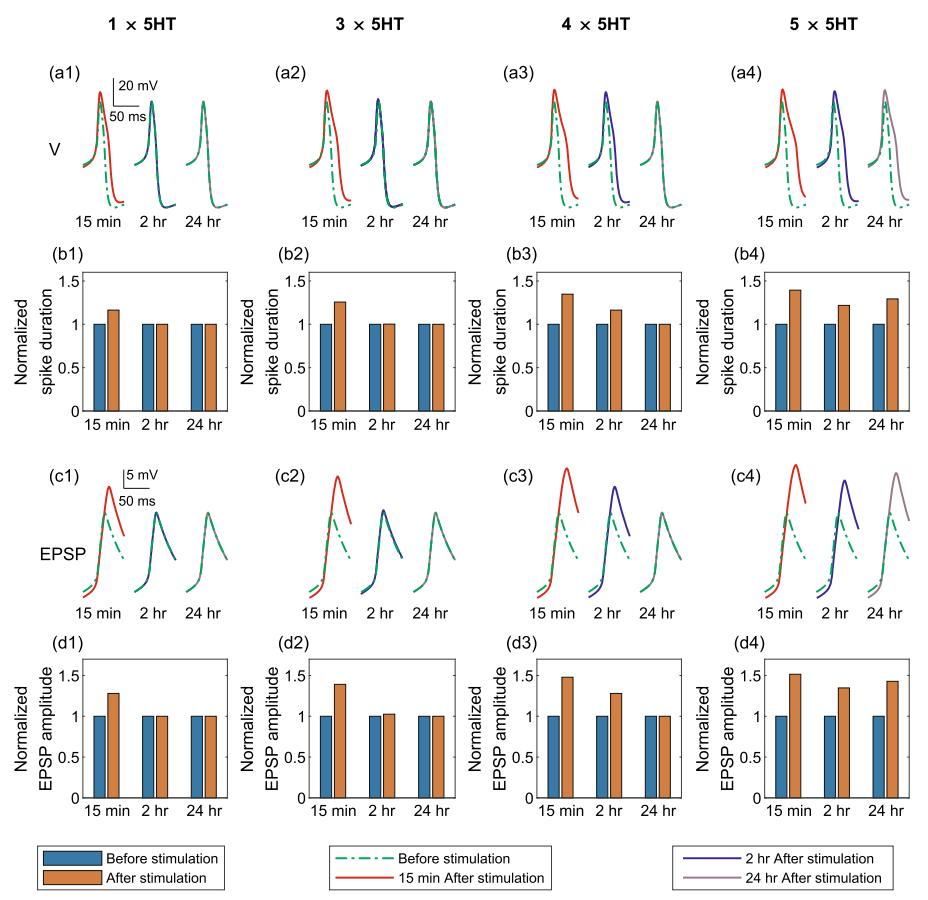 软体动物海兔的突触易化有三个阶段:短期易化、中期易化和长期易化。短期易化的诱导不依赖基因表达,中期易化的形成需要蛋白质合成,而长期易化的形成需要新的蛋白质和RNA的产生。由于基因转录和蛋白质翻译过程消耗较长的时间,导致长期突触易化的延迟发生。为了研究突触易化的三个阶段,本文提出了一个多尺度的数学模型,包括细胞内基因转录与蛋白质合成、突触前细胞膜电位和兴奋性突触后电位。基于模型中存在的正反馈回路,利用分岔分析得到系统具有双稳性,因此适当的刺激能够引起系统在不同的状态间转迁。通过采用不同的刺激方案,模型实现了短期易化、中期易化和长期易化的现象,并且模拟了中期易化对翻译过程的依赖,以及长期易化对转录和翻译的依赖,数值模拟结果与生物实验结果一致。